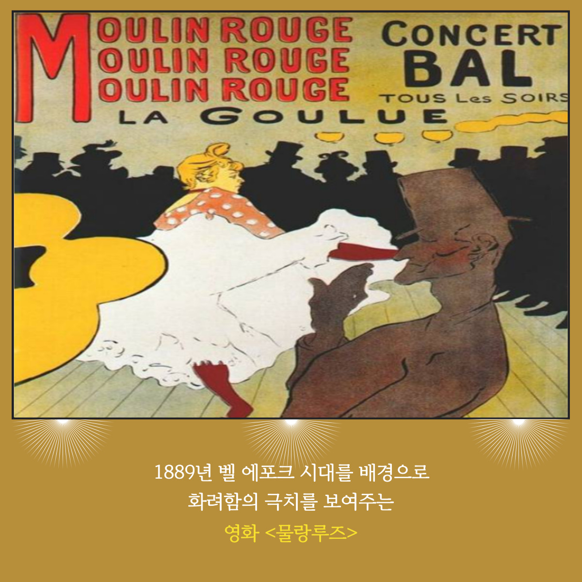 여러 편의 시대별 ‘물랑루즈(Moulin Rouge)’ 영화를 통해, 음악과 그림까지 감상할 수 있는 입체적인 시간으로, 영화 속 다양하게 표현된 벨 에포크 시대를 보며 21세기 가치관의 변화를 느낄 수 있으며 화려한 시대의 명암을 겪어낸 파리 예술인들의 우정과 사랑, 그들의 인간적인 삶의 모습을 그림으로 엮어 보여드립니다.