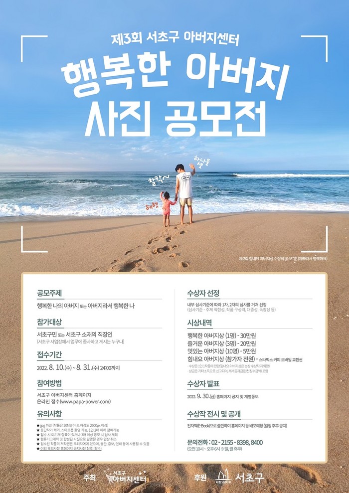 대상은 서초구민 또는 서초구 소재의 직장인(사업장)이라면 누구나 참여 가능하며, 해당주제에 맞는 사진을 1인당 2점까지 응모할 수 있다. 응모 방법은 서초구 아버지센터 홈페이지에서 31일까지 접수 받으며, 사진과 함께 본문에 성명, 연락처, 주소, 사진제목, 사진설명 등을 입력하면 된다.