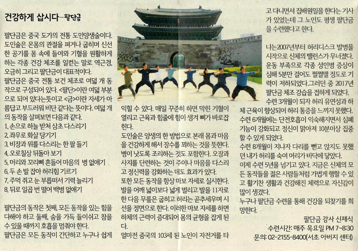 얼마전 중국의 103세 된 노인이 자전거를 타고 다니면서 집배원일을 한다는 기사가 있었는데 그 노인도 평생 팔단금을 수련했다고 한다.