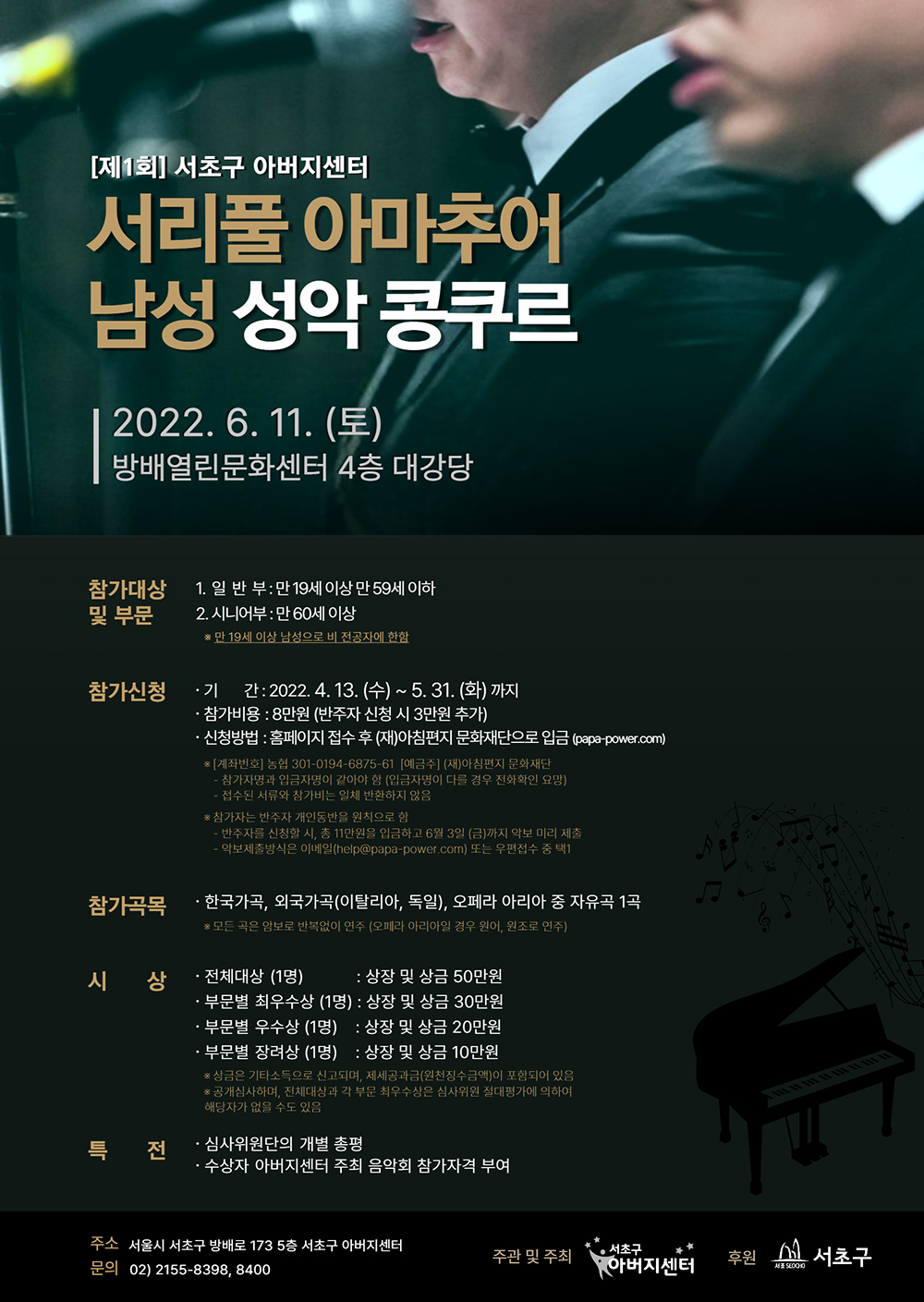 이번 ‘제1회 서리풀 아마추어 남성 성악 콩쿠르’는 음악을 사랑하고 노래에 취미를 가진 평범한 아버지들이 경연에 도전하며 노력하고 성장해가는 과정을 통해, 자존감을 높이고 행복한 성취감을 느낄 수 있도록 하기 위해 마련된 것이다.